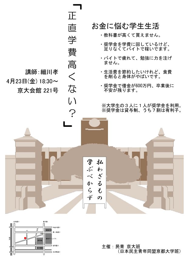 23日、龍谷大学の細川先生をお招きして開催した講演会「正直、学費高くない?」は、無事終了しました。